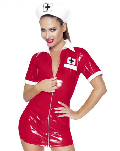 =================== Prodotto in PREVENDITA halloween. Consegna GARANTITA entro il 25 Ottobre. =================== Questo si che è un vestito per giocare sul serio! Abito in vinile dal look da infermiera Cuffia in vinile inclusa Cerniera frontale su tutta la lunghezza Look in vinile lucido per giocare al dottore! Abito corto a maniche corte realizzato in vinile rosso lucido, con dettagli a contrasto bianchi e stemma con croce nera. È attillato ed ha una cerniera a tutta lunghezza sul davanti. La cuffietta in vinile bianco può essere allacciata ed ha anche un emblema a croce sul davanti. 100% poliestere, rivestimento in poliuretano.